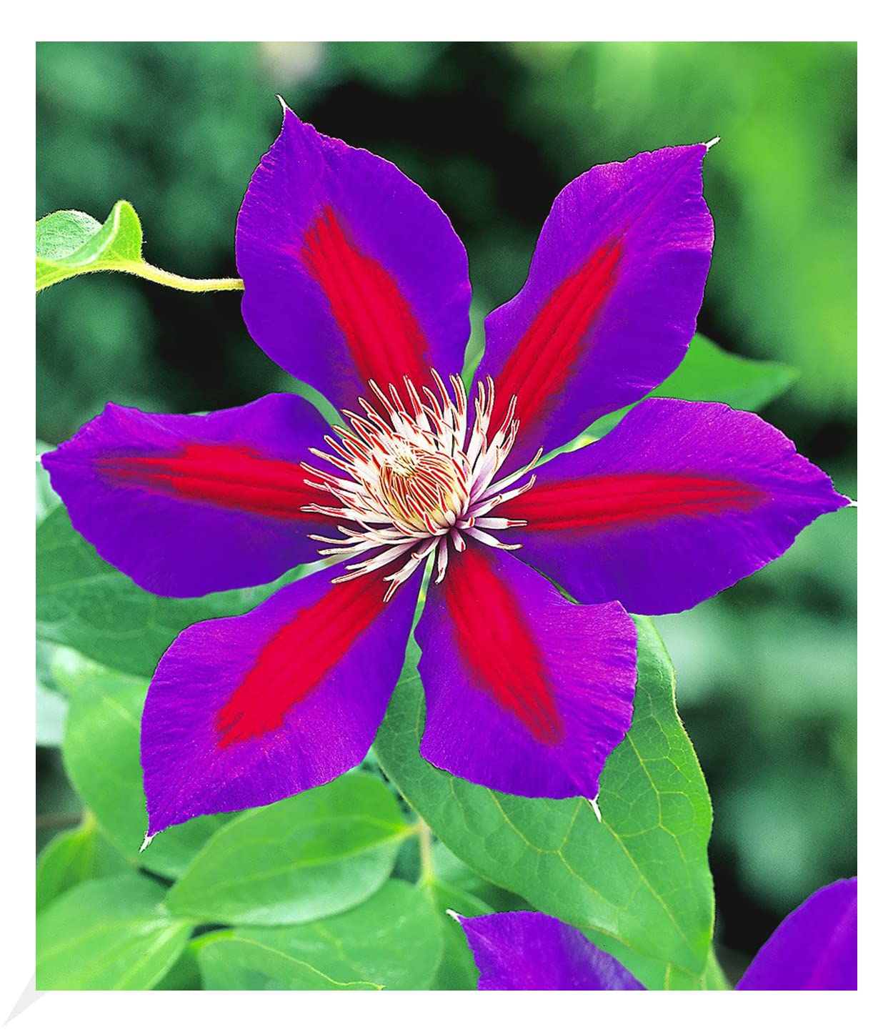 The Clematis Etoile de Malicorne fascinates with its huge flowers that feature a purple stripe on mauve coloured petals. A trellis, pergola or rose arch climbs this clematis with up to 4 metres long vines covered by a bright flower splendour. This means that the plants provide fairytale accents, even if they enter a liaison of roses. With a flower diameter of up to 16 cm, the Clematis Etoile de Malicorne (Clematis Hybrid) is a beautiful eye-catcher and you can even enjoy this spectacle twice in summer, because not only in May/June is flowering, but also again in August. September. The plant can also be planted in a pot with climbing frame and used to decorate balcony and terrace.