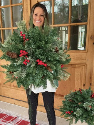 Decorated with pine cones, red berries, and a tripod stake with realistic evergreen branch tips, it can be used to fill an urn or container, and this full-bodied piece is as charming as the real thing.