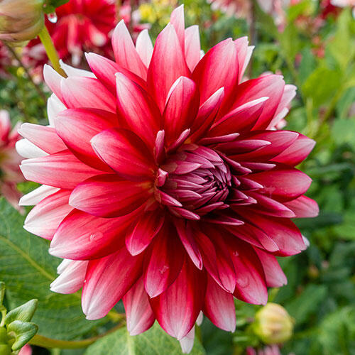 A unique variety with real flower power. Its striking, 6" blooms are filled with petals that display three colours: a very deep red that almost looks black; medium red; and white, towards the tips