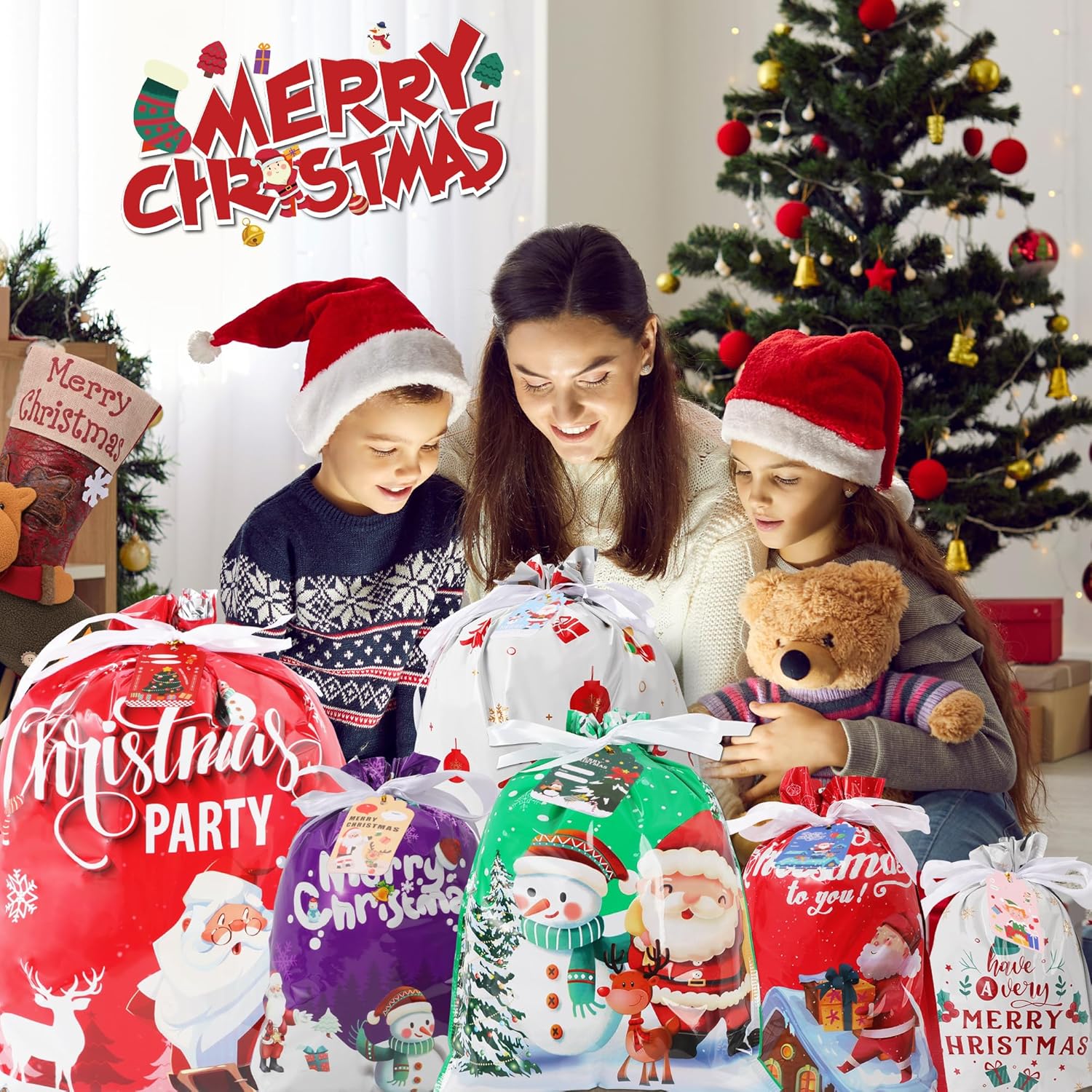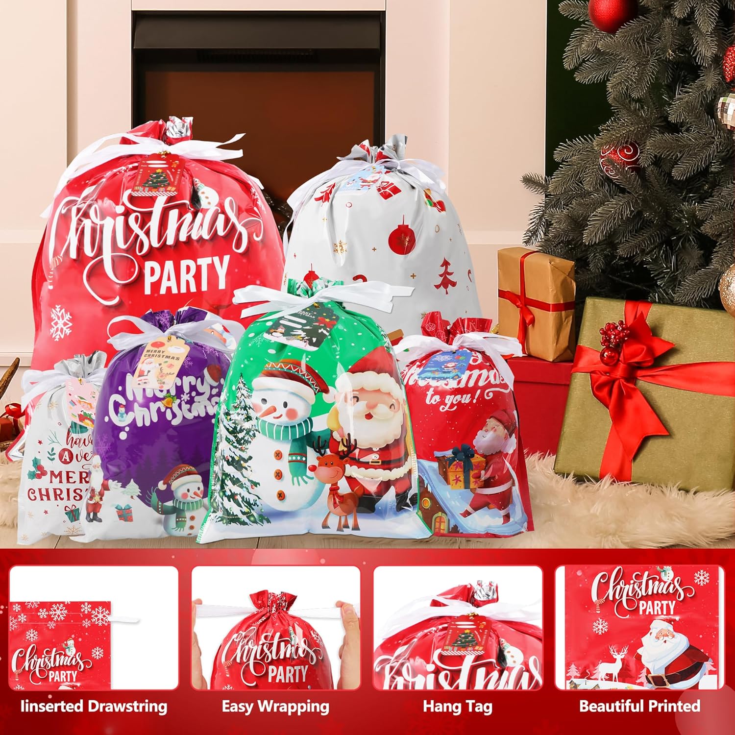 The item features Small Medium Large Jumbo holiday Bags for Gifts. These Christmas present bags can be applied to store any size of Christmas gifts, storage toys, dolls, Christmas hats, candy, and presents at a Christmas party. Storing gifts in this bag will give children more surprises because they don't know what's inside it. Perfect Christmas bags for gifts