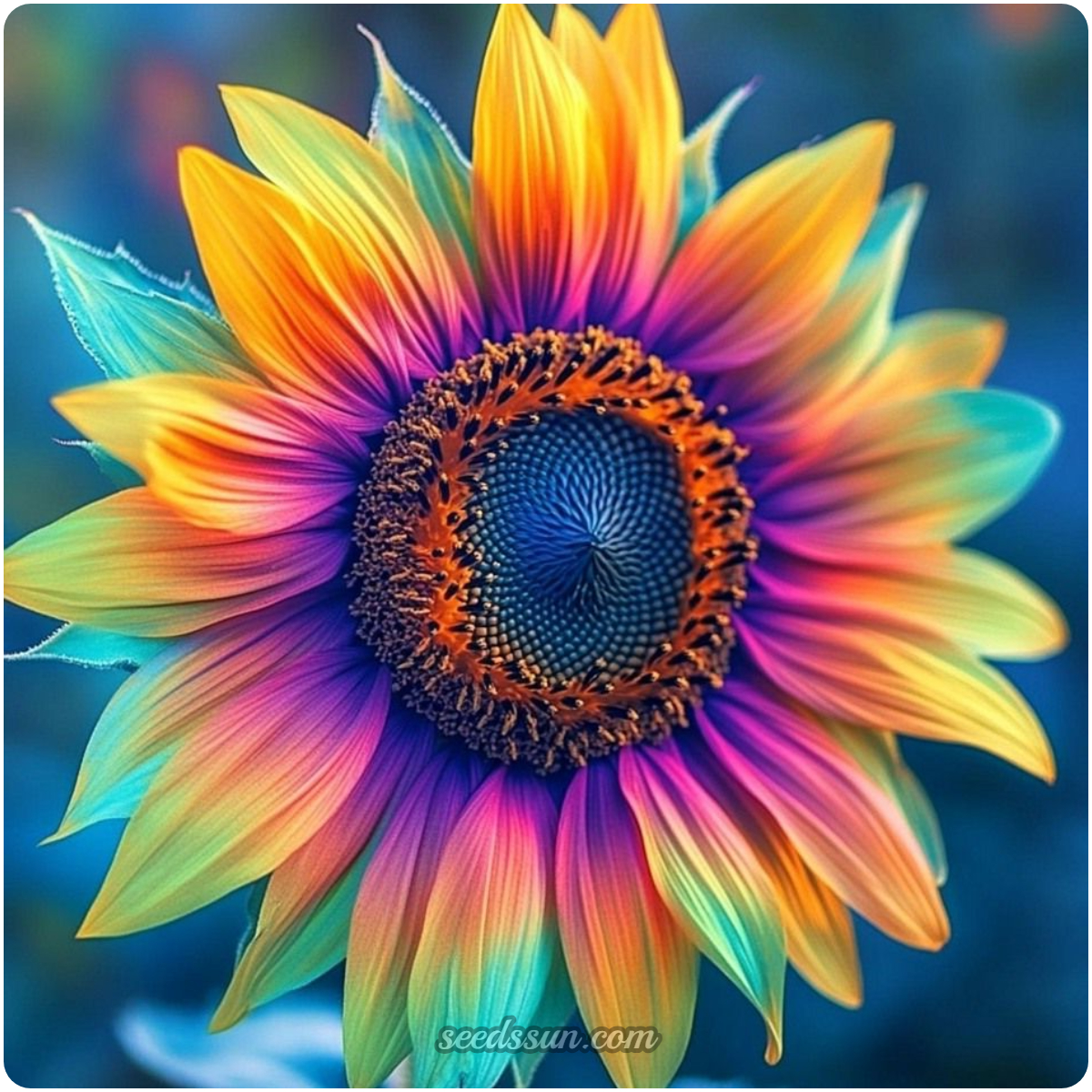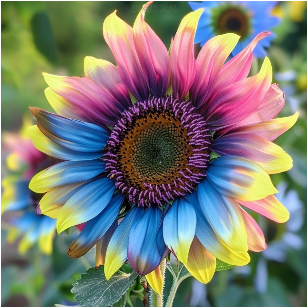 The Rainbow Sunflower enchants with its spectacular petals, featuring a mesmerizing blend of blue, pink, and yellow hues. These stunning flowers captivate any viewer and transform your garden into a vibrant display of colors.