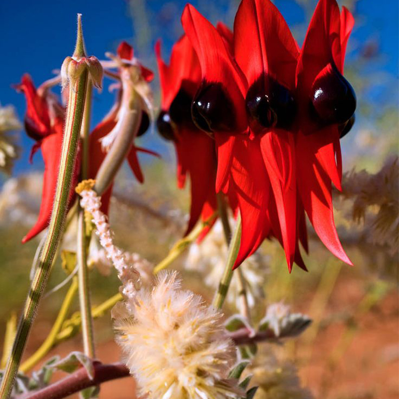 Sturt's Desert Pea is a unique pea plant native to Australia, renowned for its distinctive characteristics.This unique plant not only fascinates observers due to its ability to survive in arid conditions but also captivates with its beautiful and distinctive blossoms.