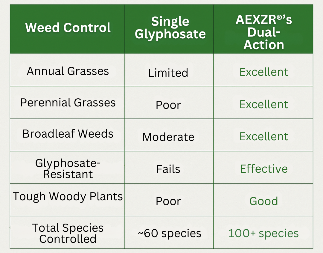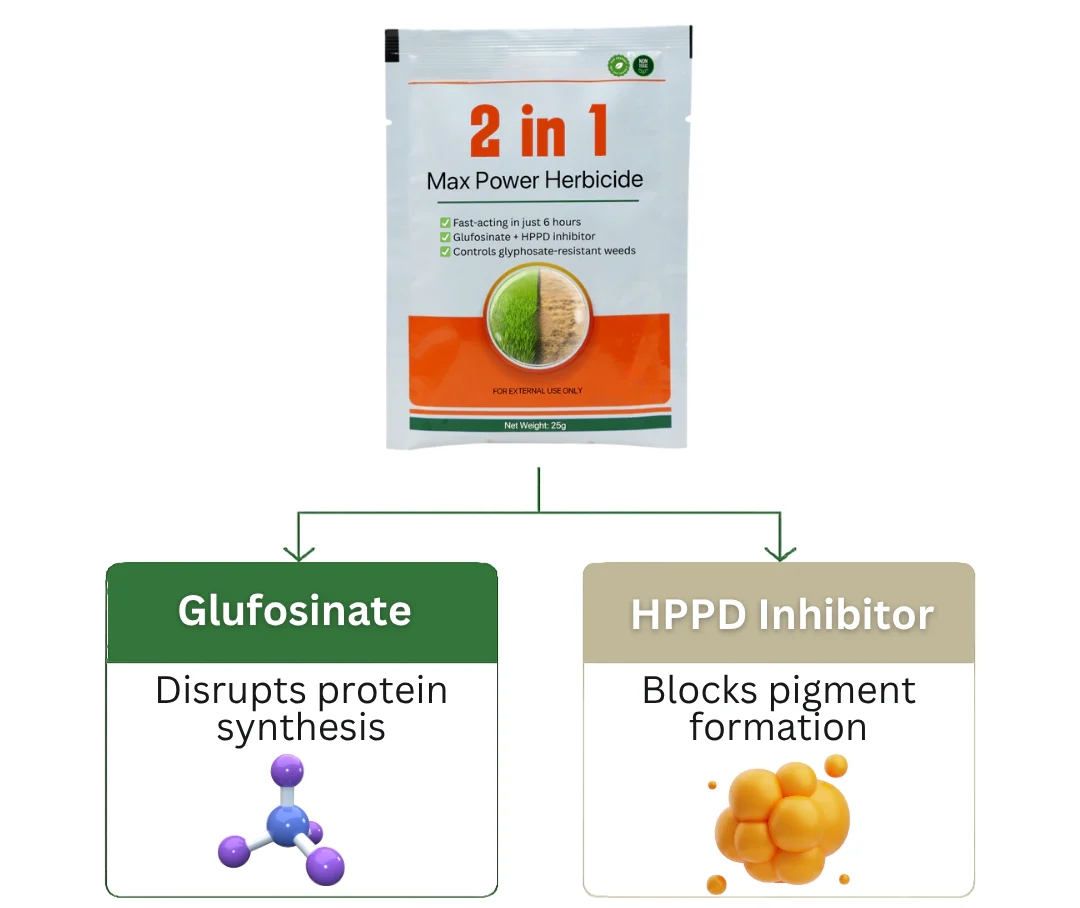 Unlike single-ingredient weed killers, this formula attacks weeds through two completely different pathways. One disrupts protein synthesis, while the other blocks pigment formation — hitting weeds from both sides.